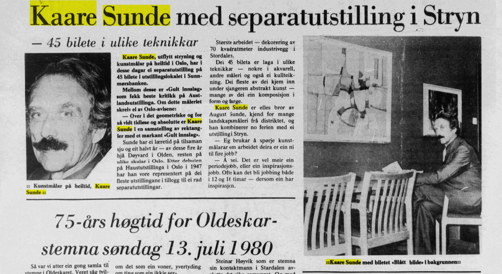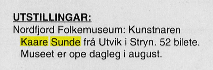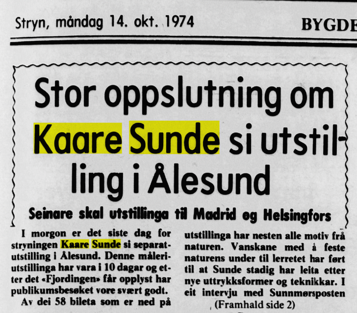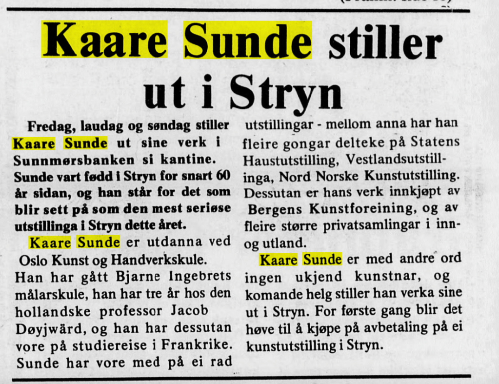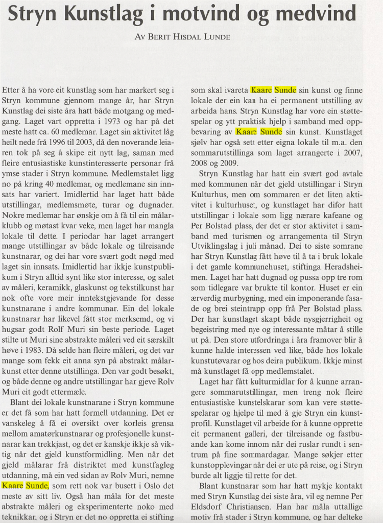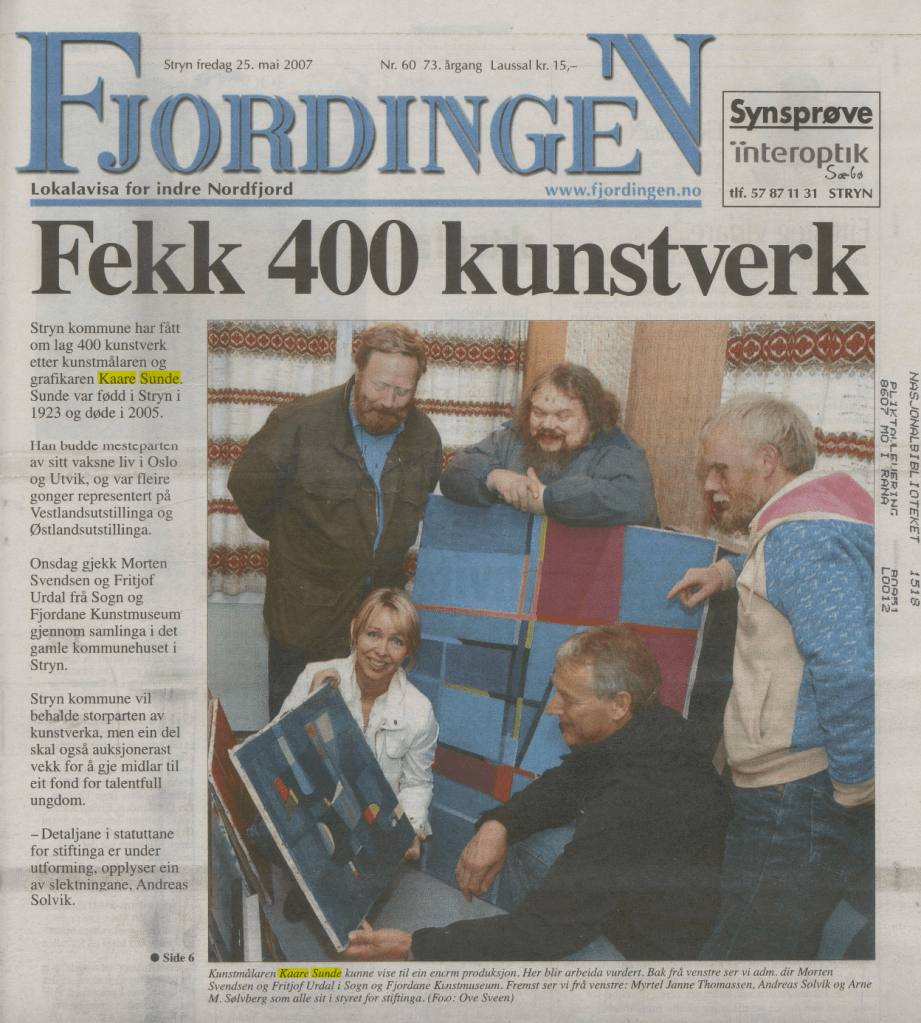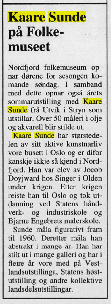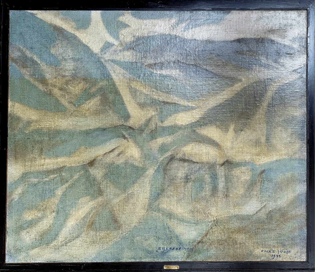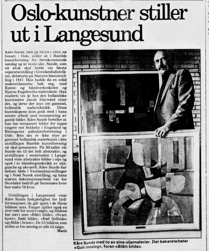 Bildekunstnaren Kaare Sunde målte figurativt fram til ca 1960. Etter dette har han målt abstrakt, vesentlig med utgangspunkt i nærbeskrivelsar av stein- og fjellformasjonar på Vestlandet. Måleria er utført i olje, nokre i ein blandingsteknikk av olje, akvarell og gouache. Har vart meir og meir abstrakt i formspråket, gjerne vart det utgangspunkt i naturmotiv. Han var også grafikar. Sunde var fødd i Stryn, men budde både i Oslo og i Utvik, og hadde samtidig ei hytte med atelier ved Mindresunde i Stryn. Vi veit at Sunde og Rolv Muri møttest her – og vi må tru dei opplevde samtaler som gav gjensidig inspirasjon. Han arbeidde også ei tid som teknisk konservator.