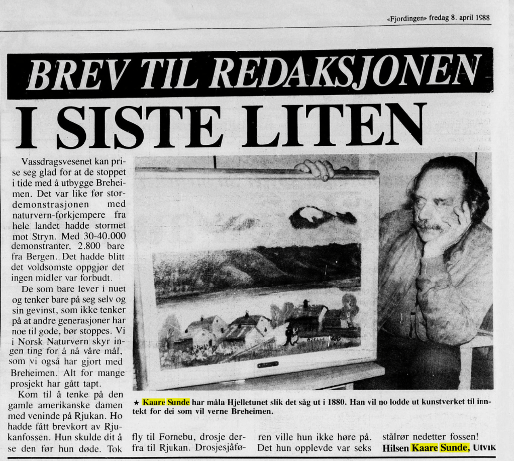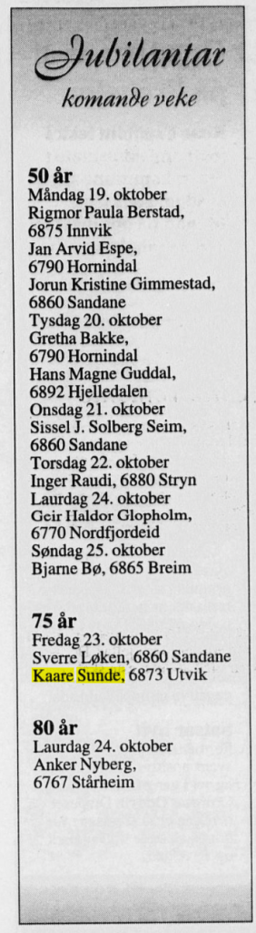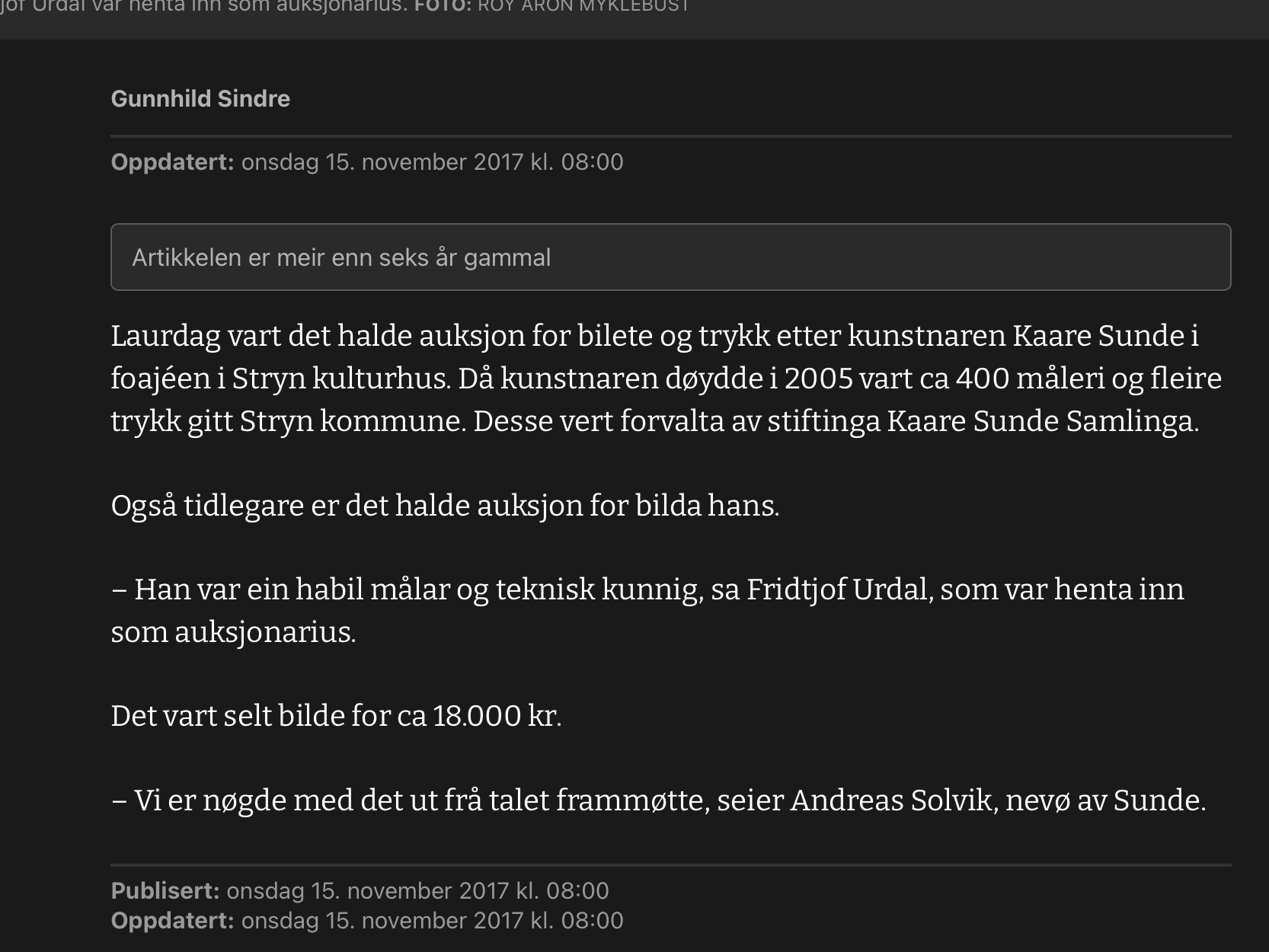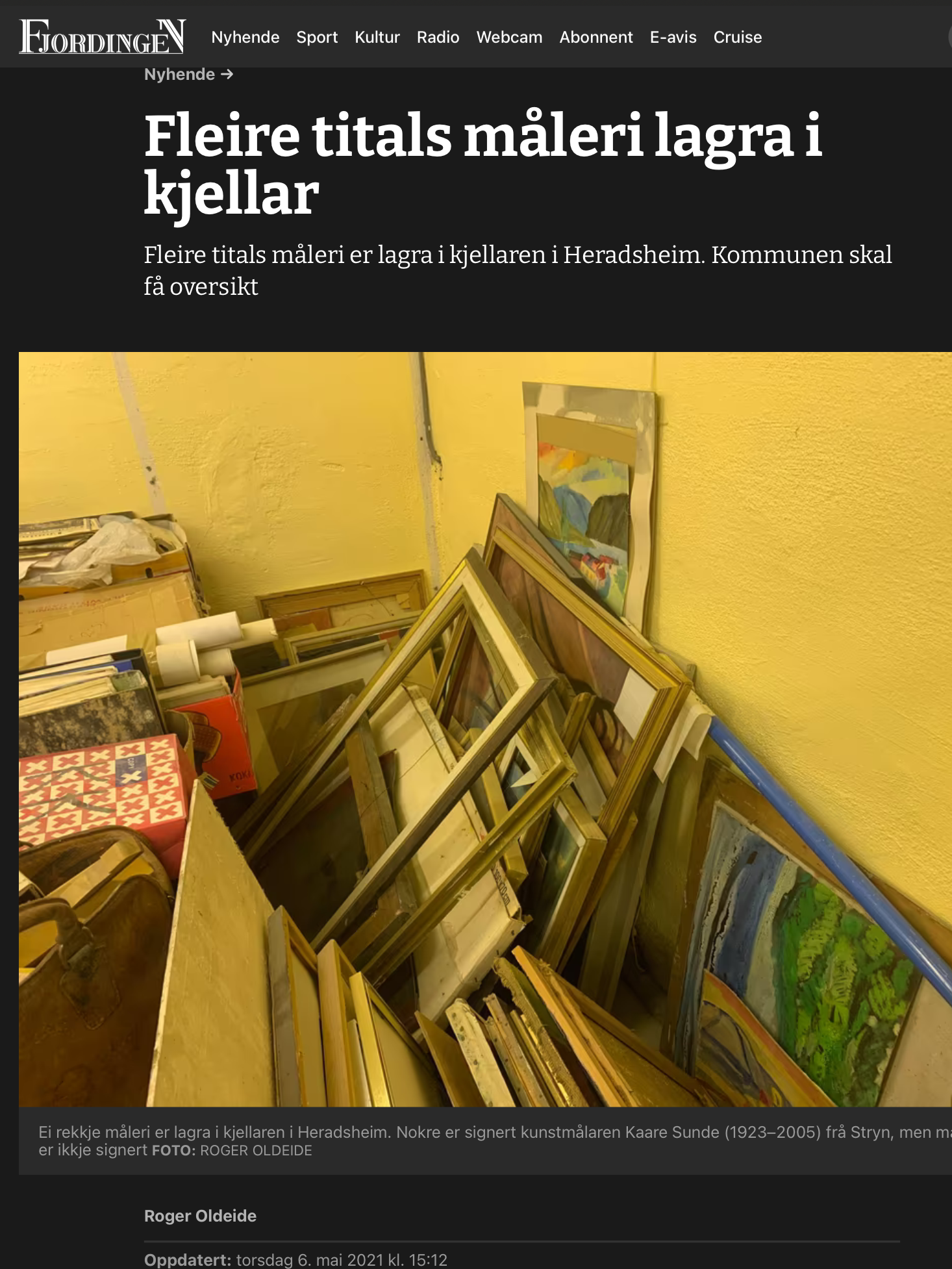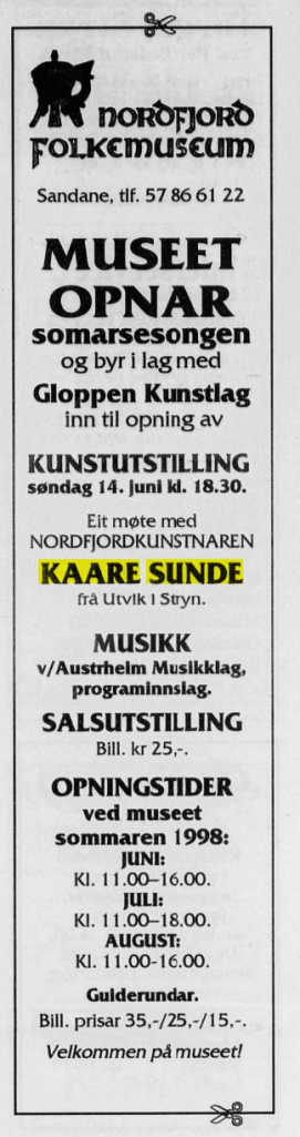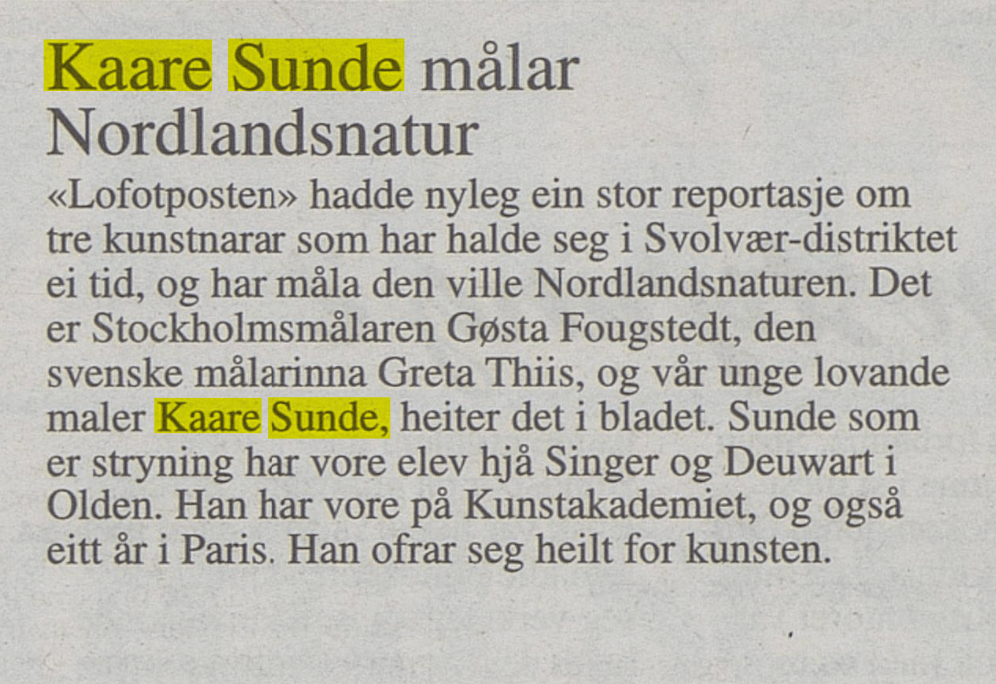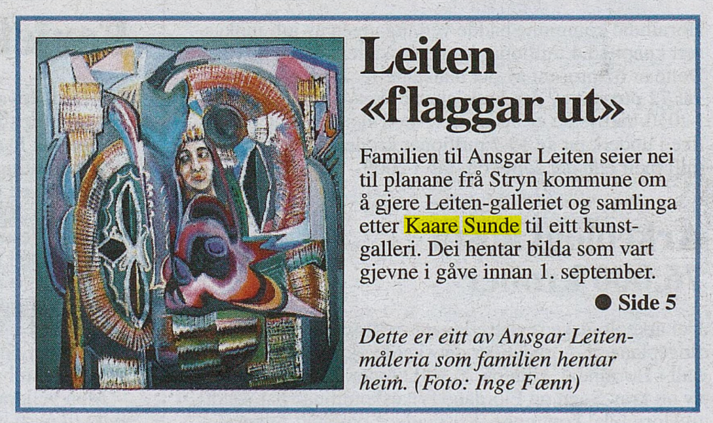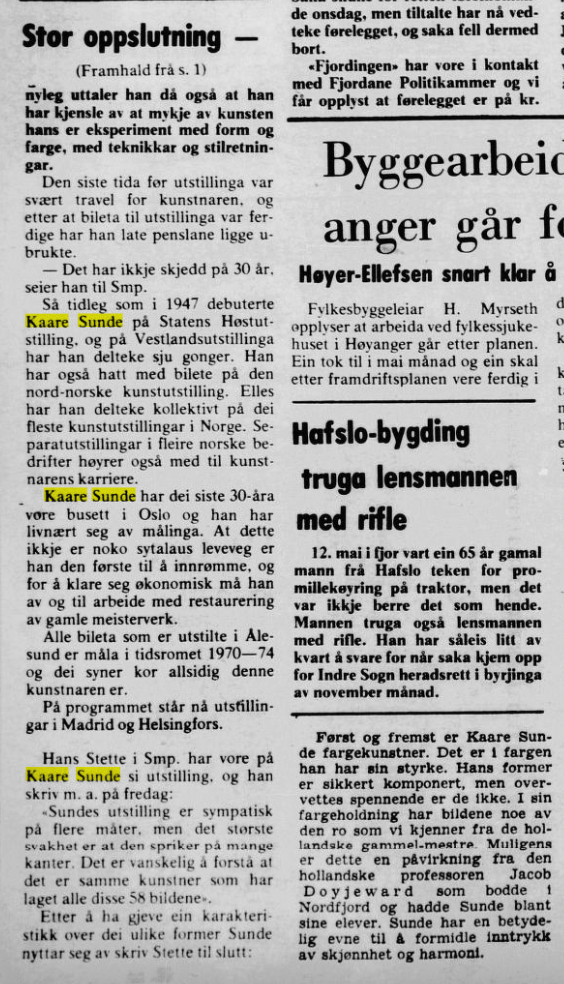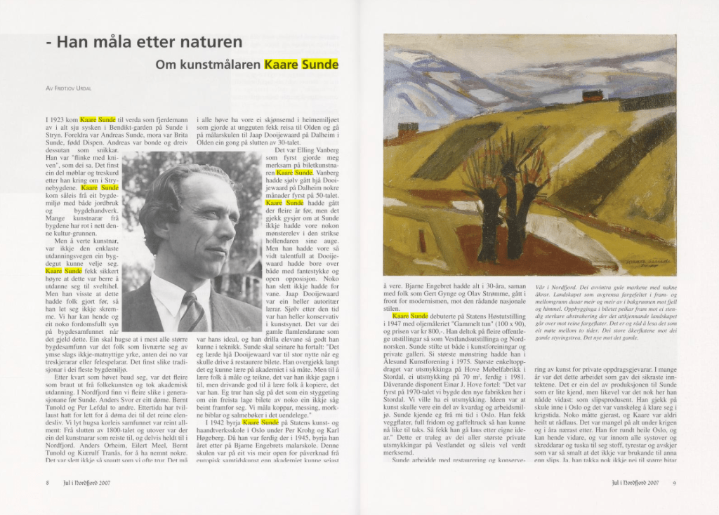 Bildekunstnaren Kaare Sunde målte figurativt fram til ca 1960. Etter dette har han målt abstrakt, vesentlig med utgangspunkt i nærbeskrivelsar av stein- og fjellformasjonar på Vestlandet. Måleria er utført i olje, nokre i ein blandingsteknikk av olje, akvarell og gouache. Har vart meir og meir abstrakt i formspråket, gjerne vart det utgangspunkt i naturmotiv. Han var også grafikar. Sunde var fødd i Stryn, men budde både i Oslo og i Utvik, og hadde samtidig ei hytte med atelier ved Mindresunde i Stryn. Vi veit at Sunde og Rolv Muri møttest her – og vi må tru dei opplevde samtaler som gav gjensidig inspirasjon. Han arbeidde også ei tid som teknisk konservator.
